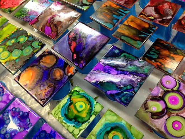 In a search for handmade Christmas gifts last year, Lynda developed an idea to create abstract art tiles after seeing a tile necklace an artist friend made with alcohol inks. The abstract art coasters have been so popular that others have asked her to teach how she designs and constructs these brightly colored, fun, tiles.